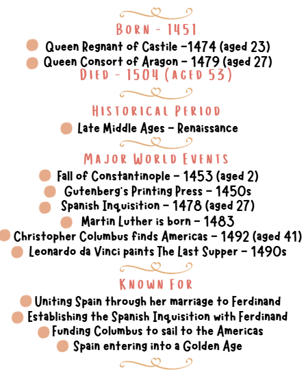 Isabella I was the Queen of Castile (Kas-teel). She married Ferdinand, the King of Aragon, and their two kingdoms joined together. They became the country we now call Spain.